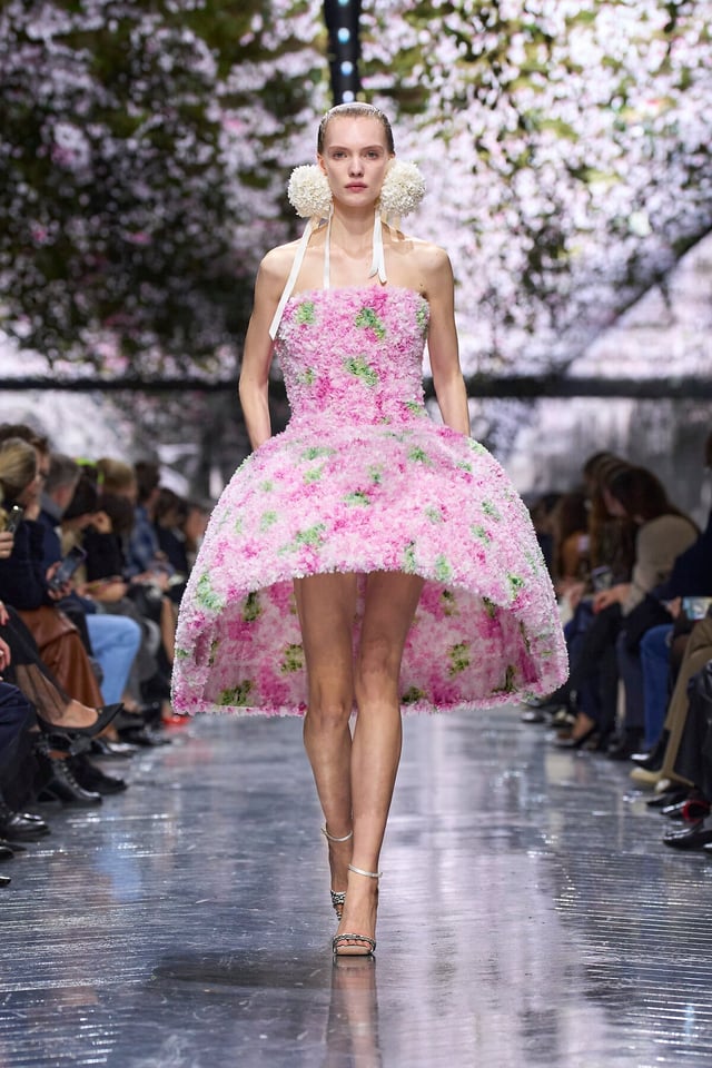 Depicting nature in motion, Anderson’s debut collection is described as “a wunderkammer the collection becomes a cabinet of wonders, where marvellous artefacts and natural forms coexist for private contemplation”. He blends floral designs and archival house codes of Dior with sculptural silhouettes that suggest movement and opulence. The set design amplifies this atmosphere, immersing the audience in an inverted natural world that complements the collection’s central motif. The collection explores a diverse range of silhouettes, from bubble skirts to avant-garde pleating. The colour palette draws directly from nature, spanning opulent yellows, soft blues, and deep burnt oranges, conveying the complexity and richness of the natural world. Materials play a pivotal role, ranging from delicate silks and intricate embroidery to leather and even the use of feathers. Nature is far from perfect, never occurring twice, always unique, and Anderson embraces this philosophy, translating it into a collection that feels new while still paying homage to Dior’s iconic heritage. Look 8 exemplifies this balance of elegance and playfulness: a bright white ruffled dress whose simplicity is elevated through intricate construction. The accessories complete the narrative, with hydrangea earrings paying homage to nature in its most literal form. Look 44 fully embraces the floral motif; a corseted bodice paired with an extravagant hoop skirt mirrors the organic shape of a flower, while three-dimensional floral appliqués create dramatic volume. The final look seamlessly merges Anderson’s avant-garde sensibility with Dior’s enduring elegance. An ivory gown with an asymmetric neckline is lined with delicate florals, while a cinched bodice flows into a cascading skirt adorned with floral appliqué that extends into a train. The design culminates in a harmonious dialogue between Anderson’s contemporary vision and the house’s timeless refinement, making his debut couture collection remarkably difficult to surpass.